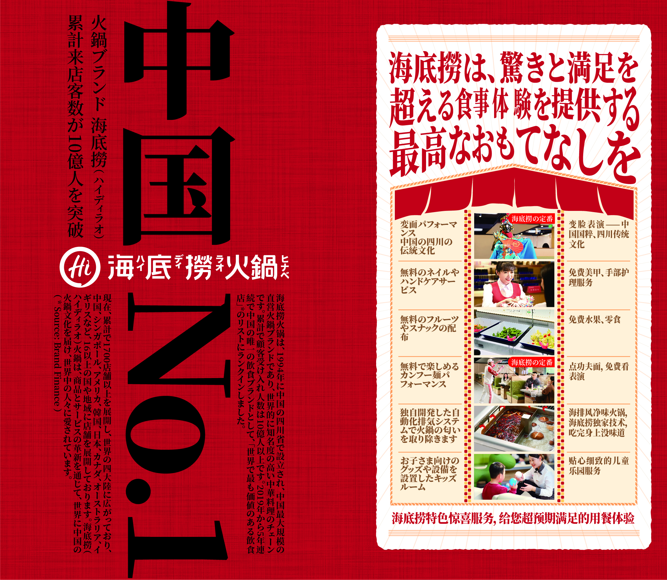海底撈火锅は、1994年に中国の四川省で設立され、中国最大規模の直営火鍋ブランドであり、世界的に知名度の高い中華料理のチェーンです。累計で顧客受け入れ人数は10億人以上です。